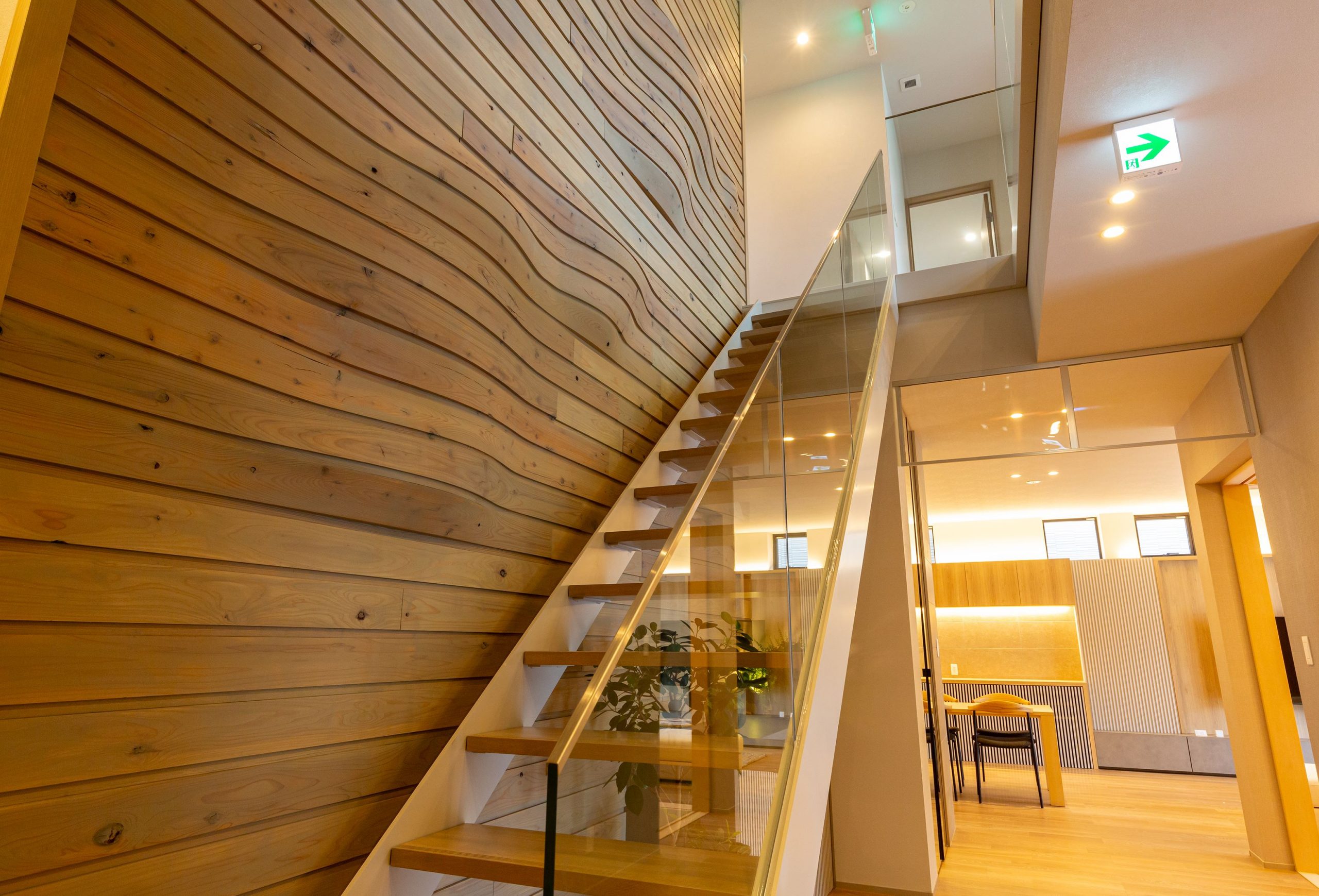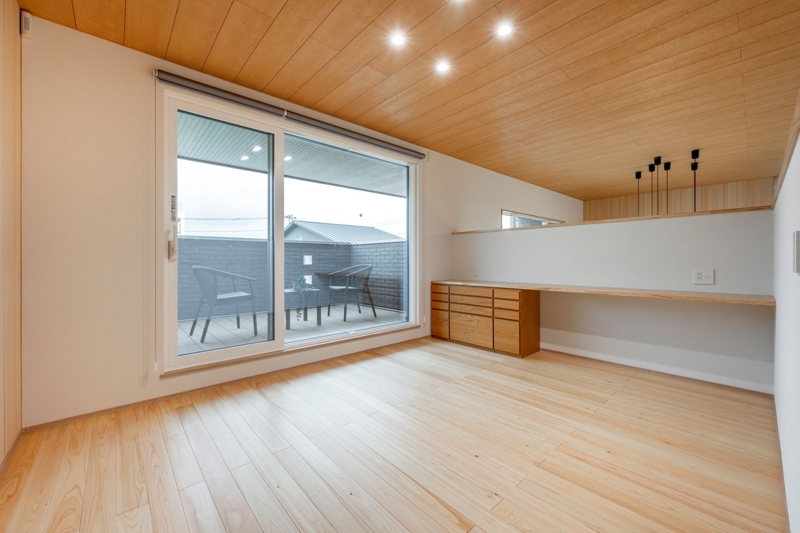 吹き抜けの上部の開放感とともに、内装材をすべて檜で統一して奥行き感も造り出します