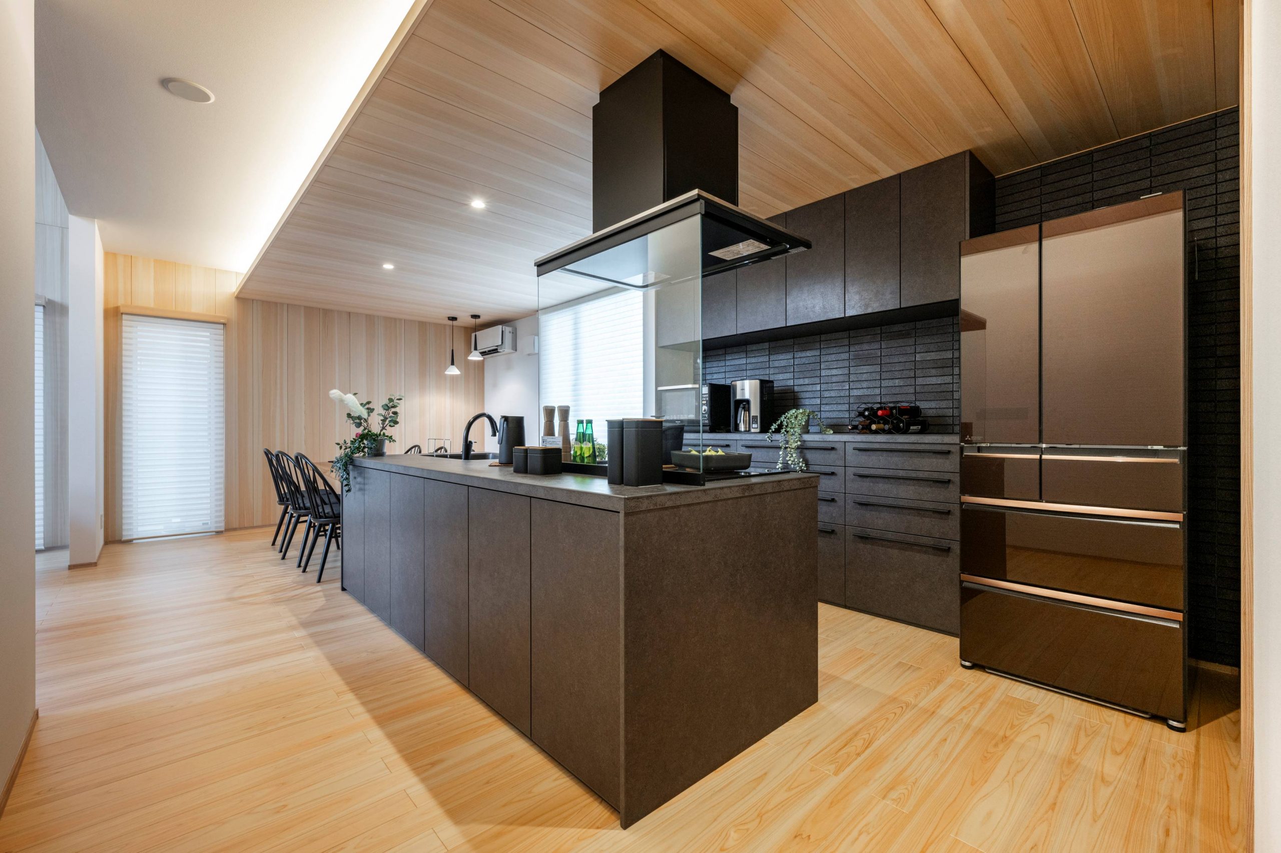 壁・天井を檜材に統一した優しい印象の和のダイニングとなっております
