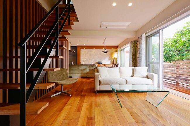 木質感たっぷりのLDK 床には国産のナラ材、天井には現し梁を取り入れました。
