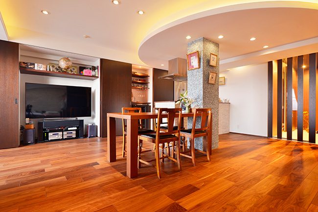 国産ナラ材、ニレ、オニグルミなど質感豊かで肌触りの良い床材を採用し、折り上げ天井の現し梁も併せて住友林業らしい木質感でお出迎えします。