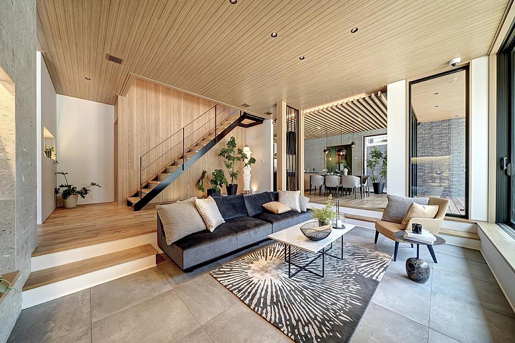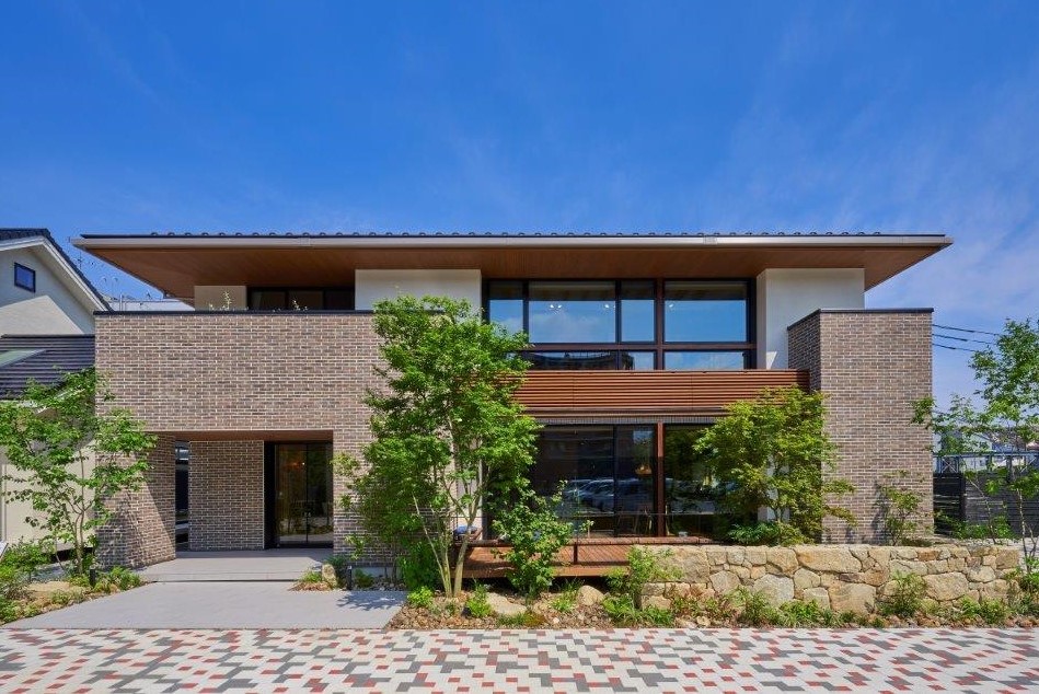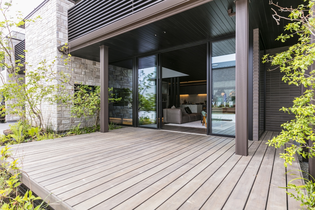 自然素材のタイルと木質感溢れる外観デザイン、深い軒も印象を強く落ち着いた雰囲気を醸し出し、大開口のサッシはビッグフレームらしく開放感と明るさを演出します。