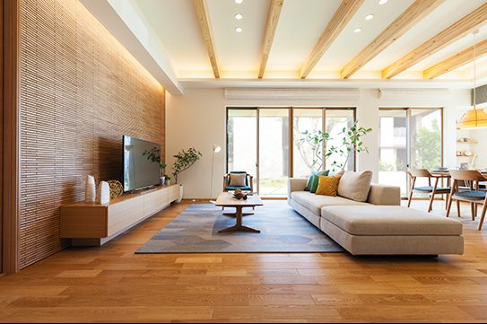 大空間・大開口の心地よい開放感と現し梁、ウッドタイルによる豊かな木質感を合わせた癒しと寛ぎの空間