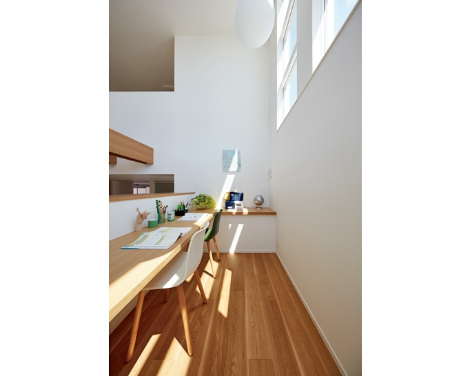 吹き抜けに面したスキップフロアにお子様用のスタディコーナーを設けました。リビングから目が届き、ママにも安心の設計です。