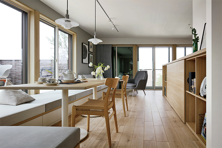 自然素材床材を採用した北欧スタイル。机や照明、TVを可動することで、好きな場所で食事を楽しめる空間。