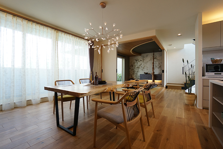 リビングと和室が一体型の広々とした空間。四季折々のお庭や3Fならではの眺望が魅力的です。
