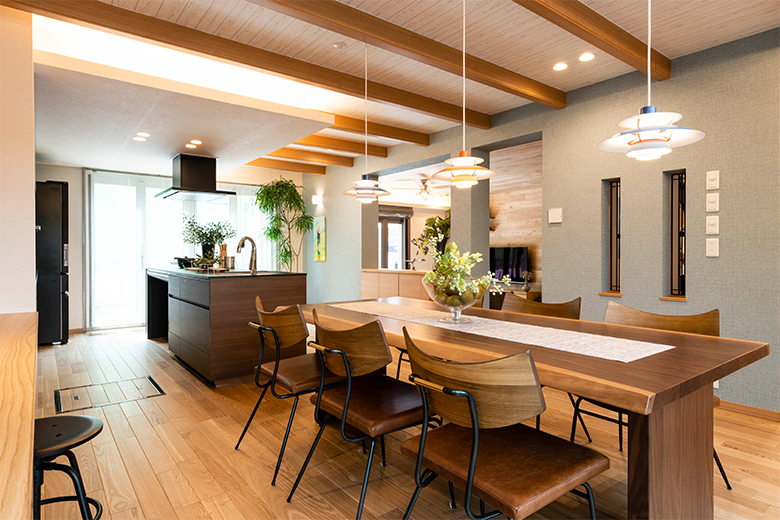 国産ナラ材を用いたナチュラルなインテリアと、家事分担・家族のコミュニケーションを生みだす広々空間。