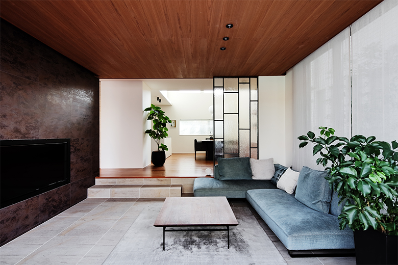 リビング全体の床を下げ、開放感と視線の変化を楽しみながら、今日も家族団らん。