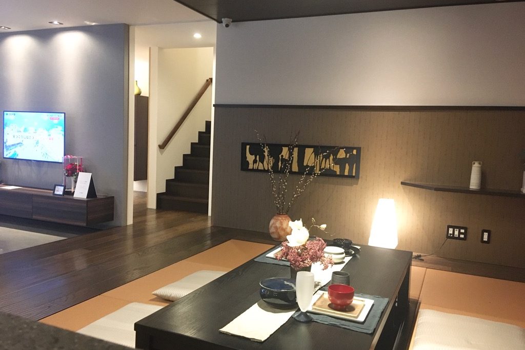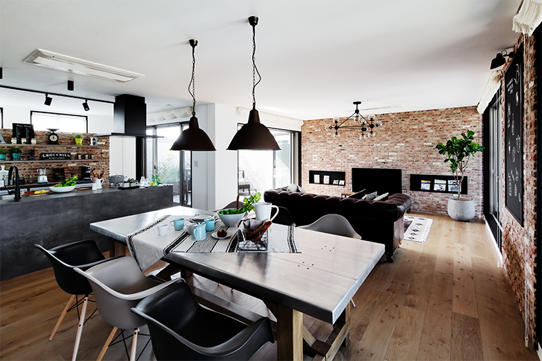 なぐり調フロアとタイル仕上げの土間リビングを融合した和モダンなインテリア。