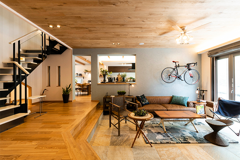 壁には趣味の自転車等が配置され、スッテプダウンさせることで、外と繋がる開放感あるリビング。