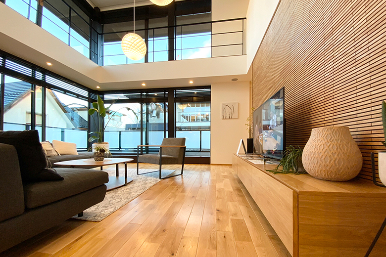 最上階に配置したLDKは連窓による大開口とフルフラットバルコニーをご覧いただけます。