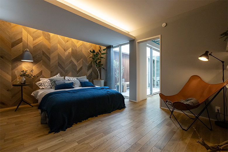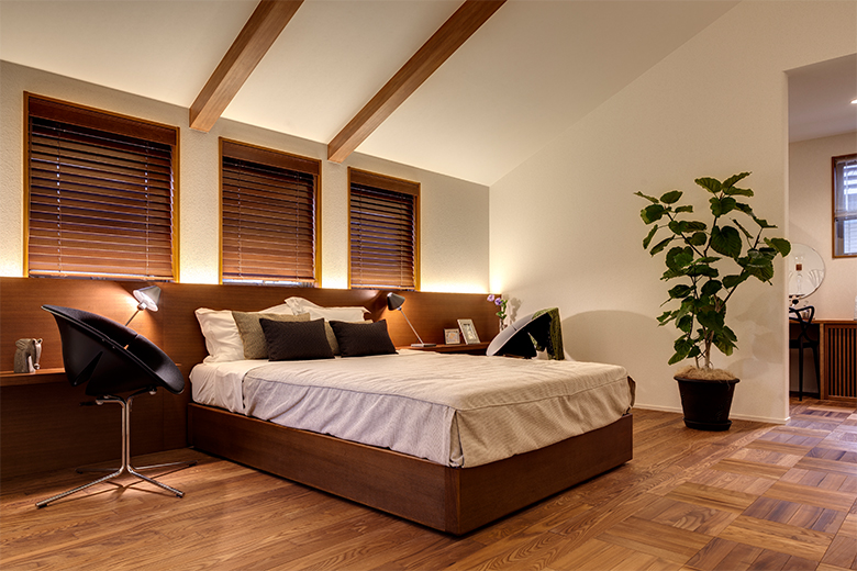 勾配天井の梁とデザイン貼の無垢床で変化をつけ、くつろぎを演出する寝室