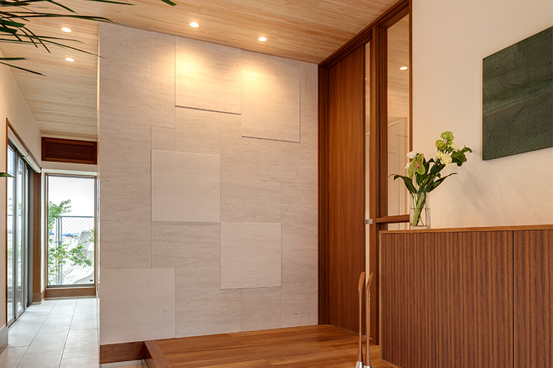 - 木・石・タイルを組合せ、素材感を高めたスローモダンの家