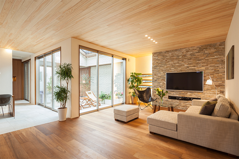 インナーテラスを囲み、通風・採光はもちろん外とのつながりを重視した間取りです。外観は切妻とし、白い外壁と存在感ある石材、個性的なタイルをポイントにしています。内装は自然素材をふんだんに使い、天井を板の同一素材で仕上げることにより、住まい全体を統一感ある空間にしています。ソーラー発電とガスとのダブル発電や、電気自動車(EV)対応の設備も整えています。