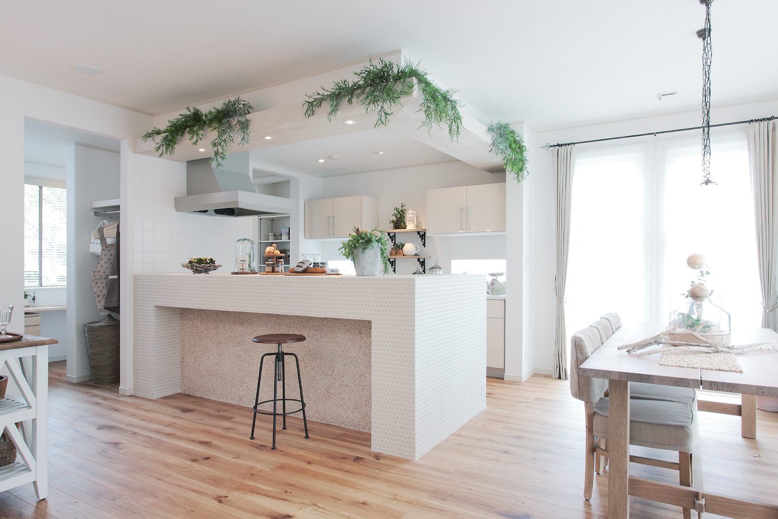 フレンチカントリーをテーマに、モザイクタイルやグリーン、化粧梁など、素材感にこだわりました