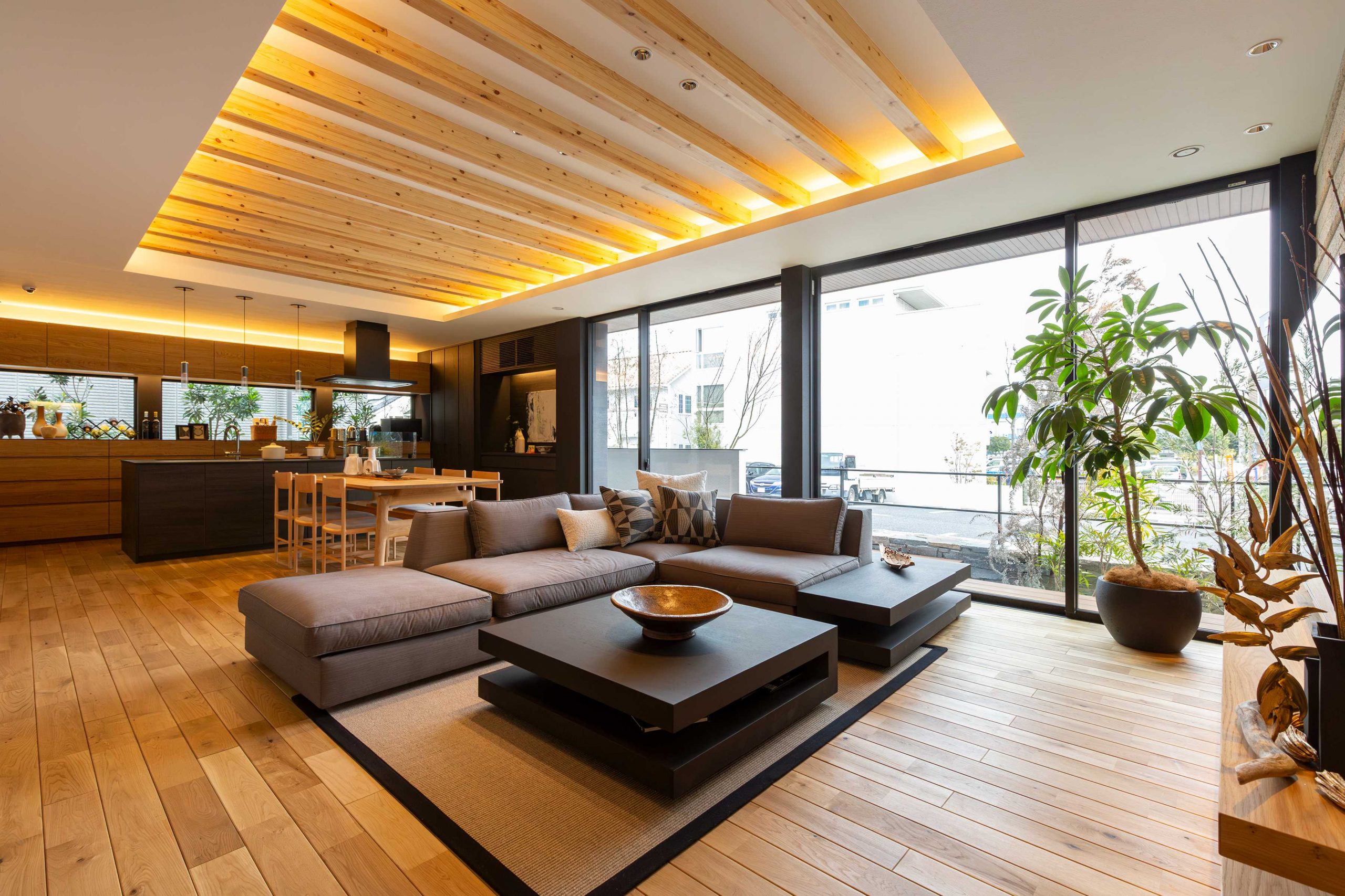 国産ナラ無垢材の床やあらわし梁による木のぬくもりと温かさを演出した大開口の明るいリビング