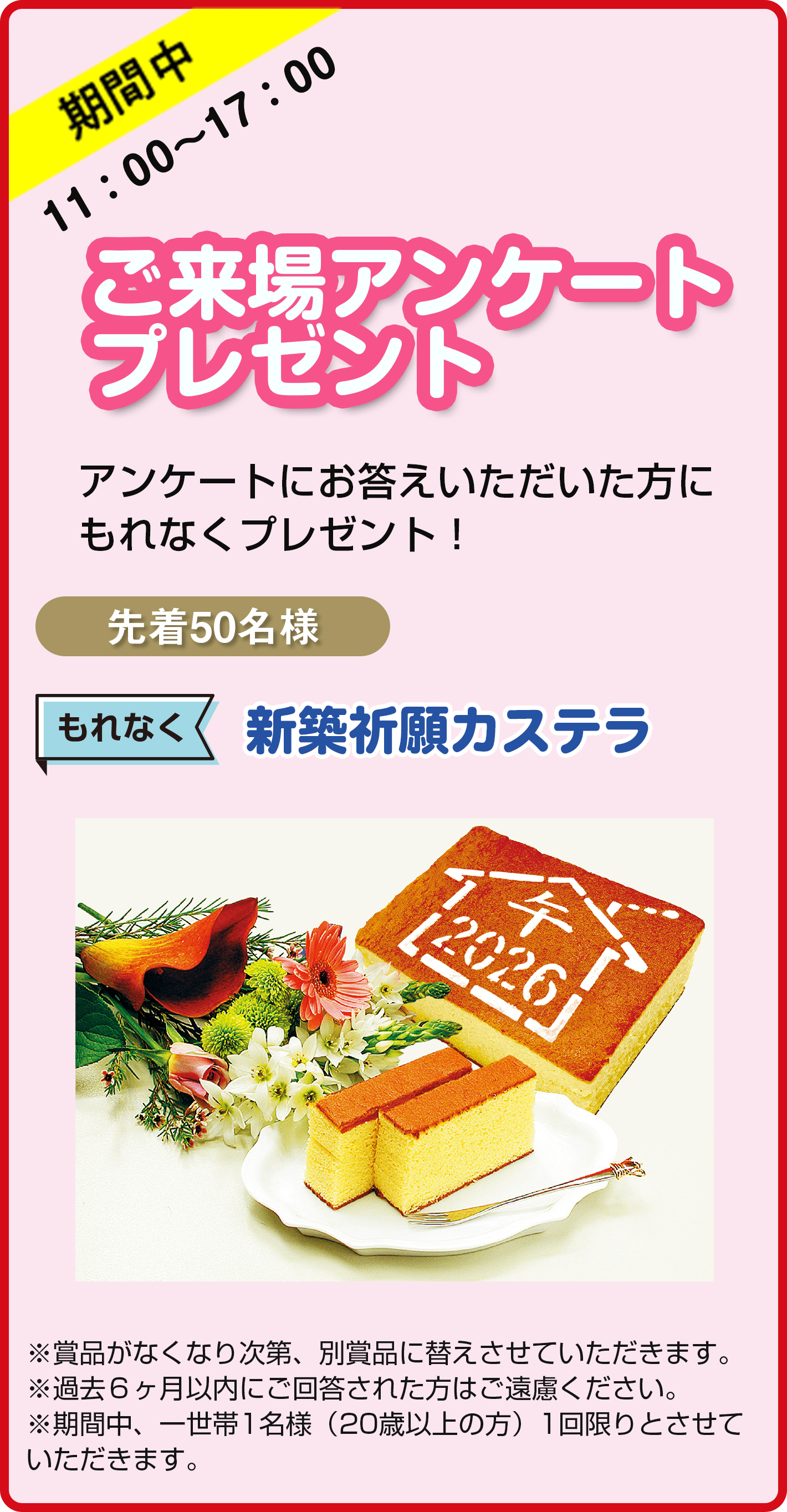※各イベントの写真はイメージです。※お子様のみのイベント参加はご遠慮ください。※会場内での許可のない撮影は禁止させていただきます。※イベントはハウスメーカーとのご商談及びご契約いただいた方を優先させていただく場合がございます。(一部イベントを除く)※お客様の混雑状況及び天候等の諸事情により急遽イベントの内容を変更・中止する場合がございます。