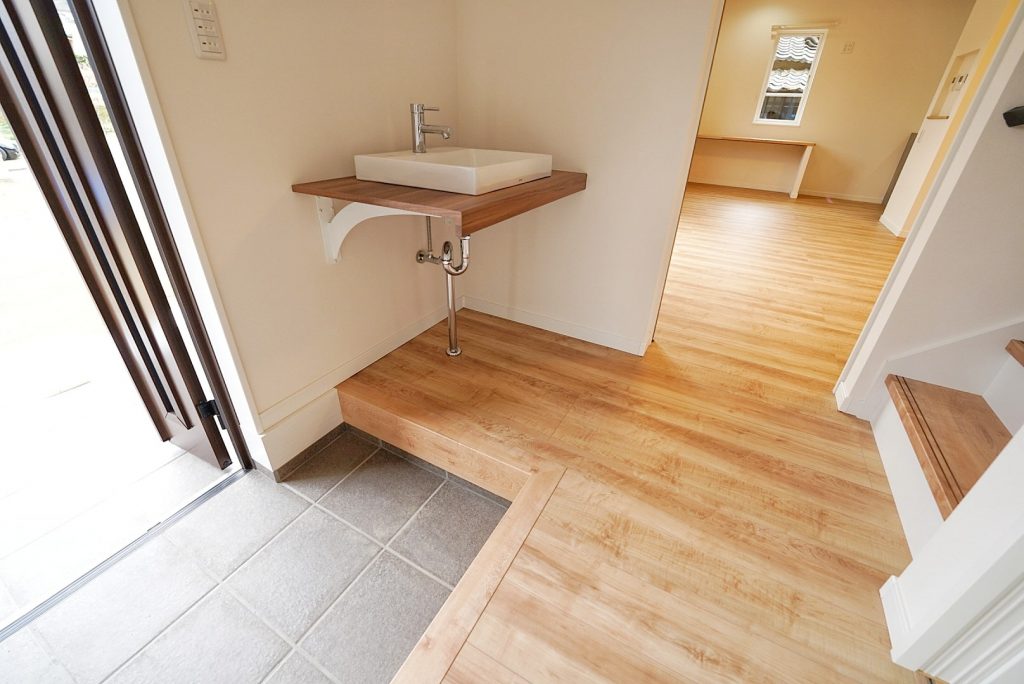 洗面台周りは水がはねやすいので、対策が必要です。収納扉の表面や、周辺の壁を耐水性の高いものにしましょう。ボウル型の洗面器を設置する場合、カウンターの天板は水に強いタイルや石などを選びましょう。玄関が和のイメージで無垢材を採用する場合、水分を弾く表面処理をおこなってください。