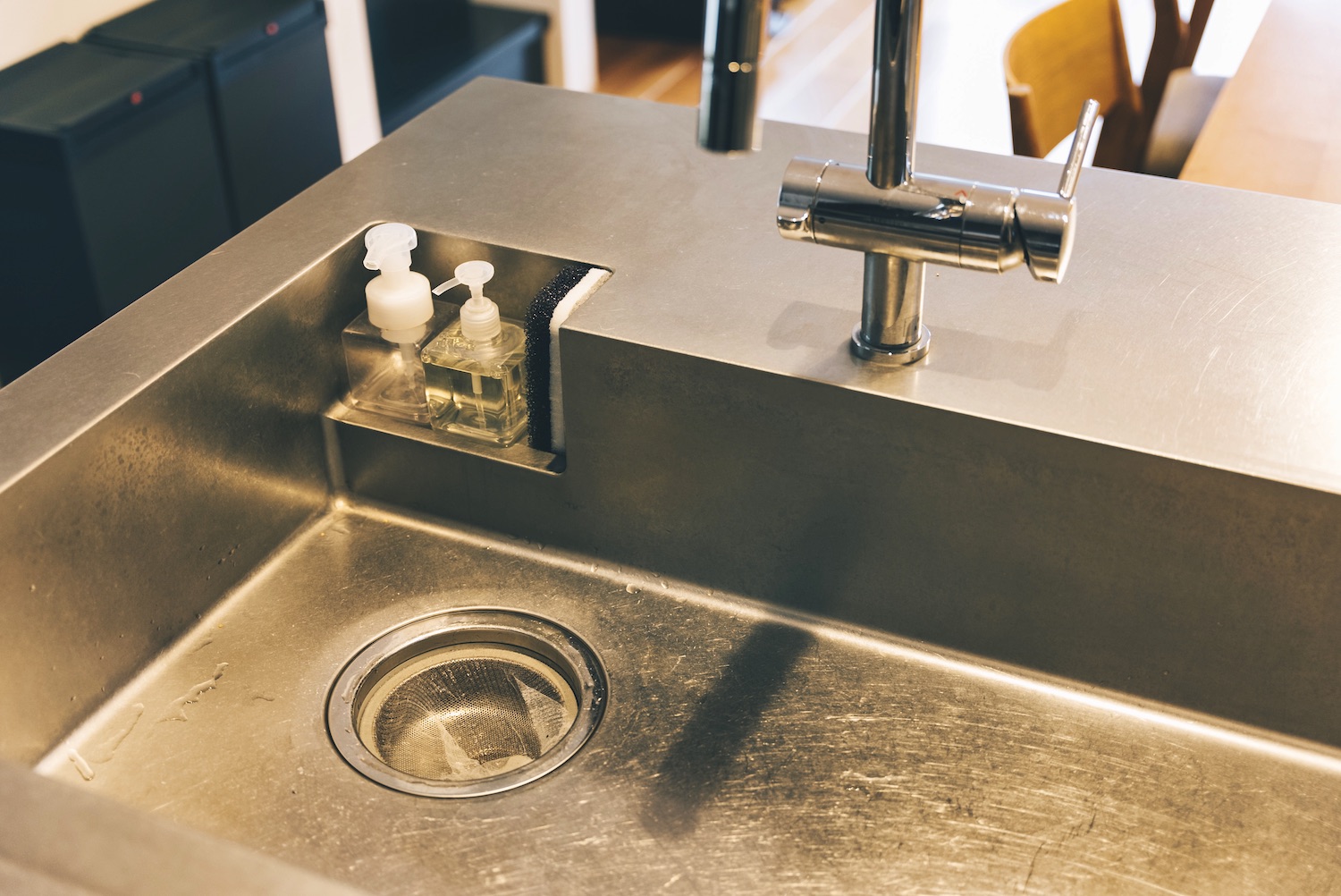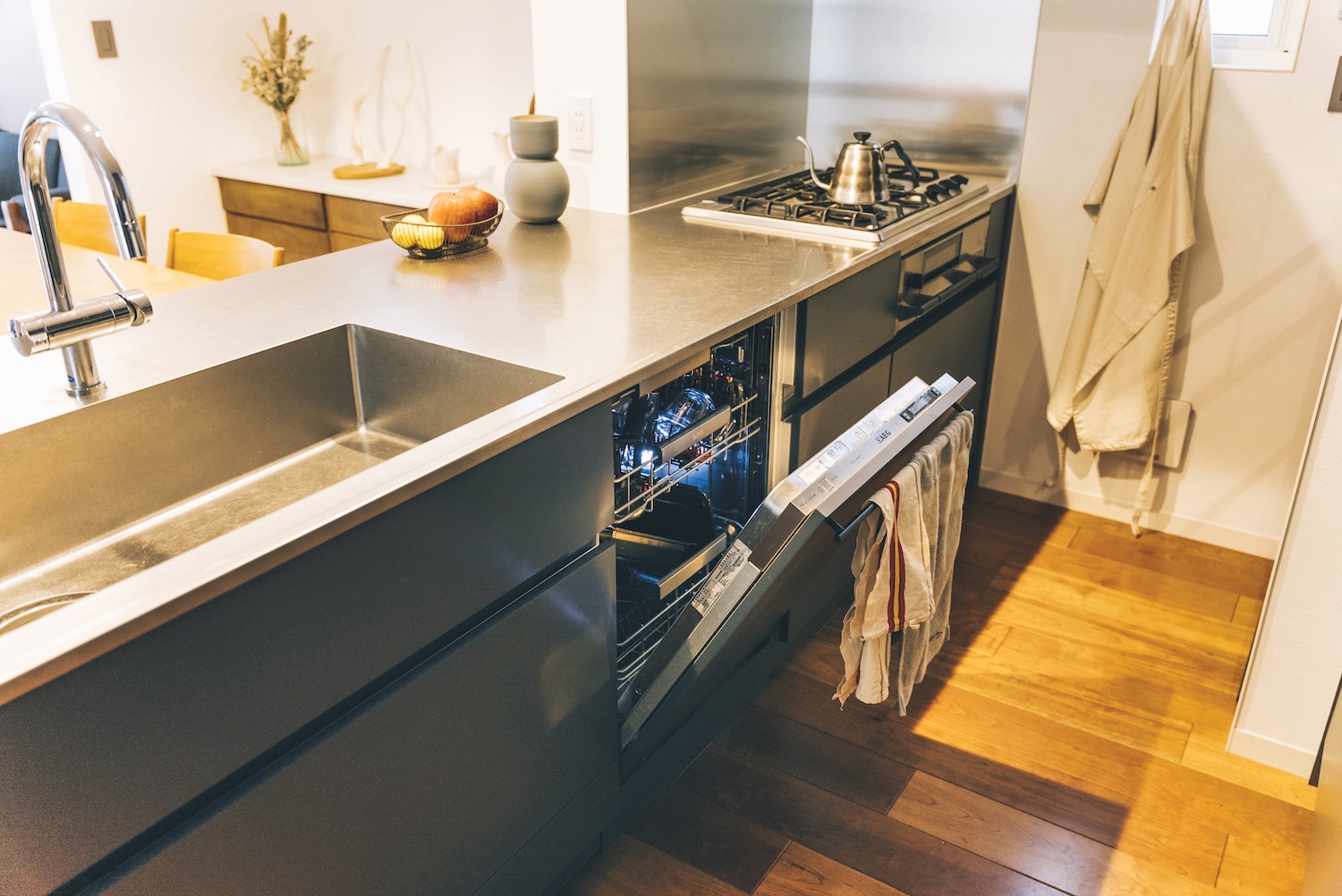 シンクも食器をドサッと入れられるサイズ感を特注でつくりました。お客さんがいるリビング側からは見えない位置に食器用洗剤の収納を設置するなど、細かなこだわりをどんどん採用したら、建築費全体の10%以上をキッチンが占めることになってしまいました。
