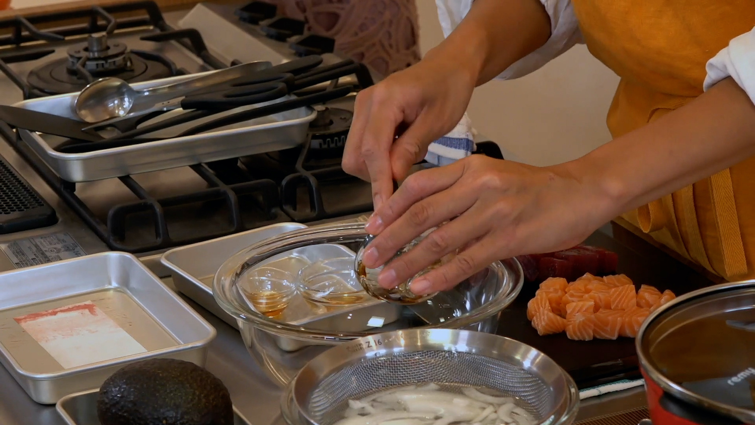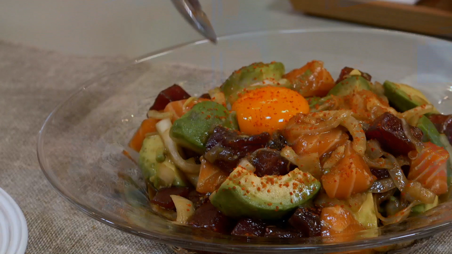 最初の料理は「お刺身とアボカドの漬け 卵黄コーティング仕上げ」。美味しそうなサーモンとマグロのお刺身にアボカドを合わせ、特製のタレと卵黄を絡めていただくお料理で「オイスターソースの風味がお魚にとっても合います」と和田さん。