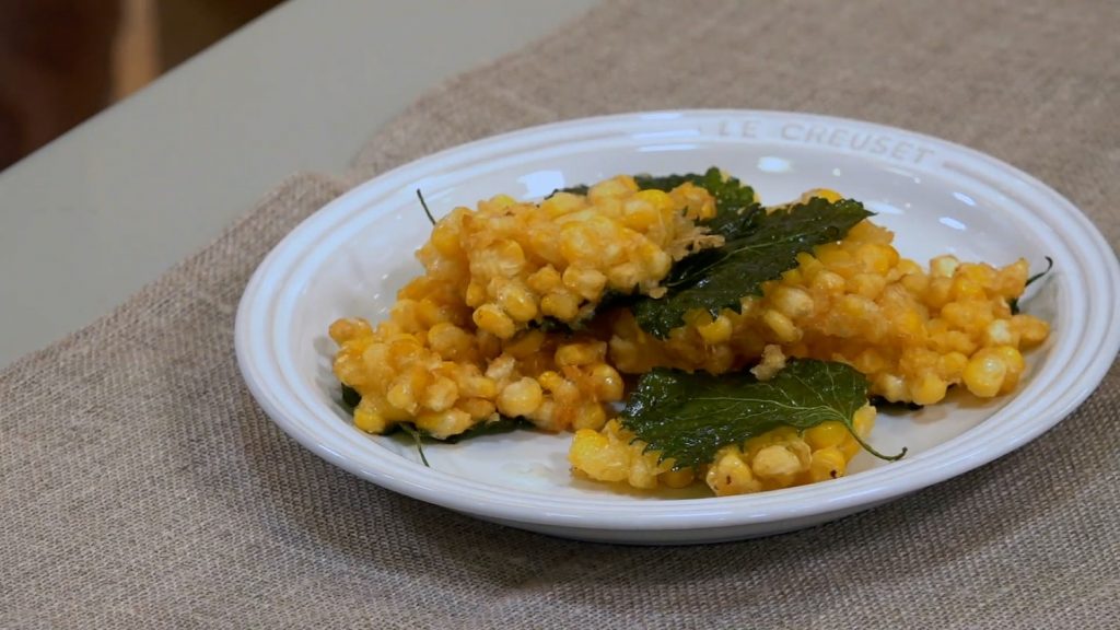 最後は「とうもろこしと大葉のかき揚げ」。こちらは旬のとうもろこしをたっぷり使って、大葉とともにかき揚げにした一品。