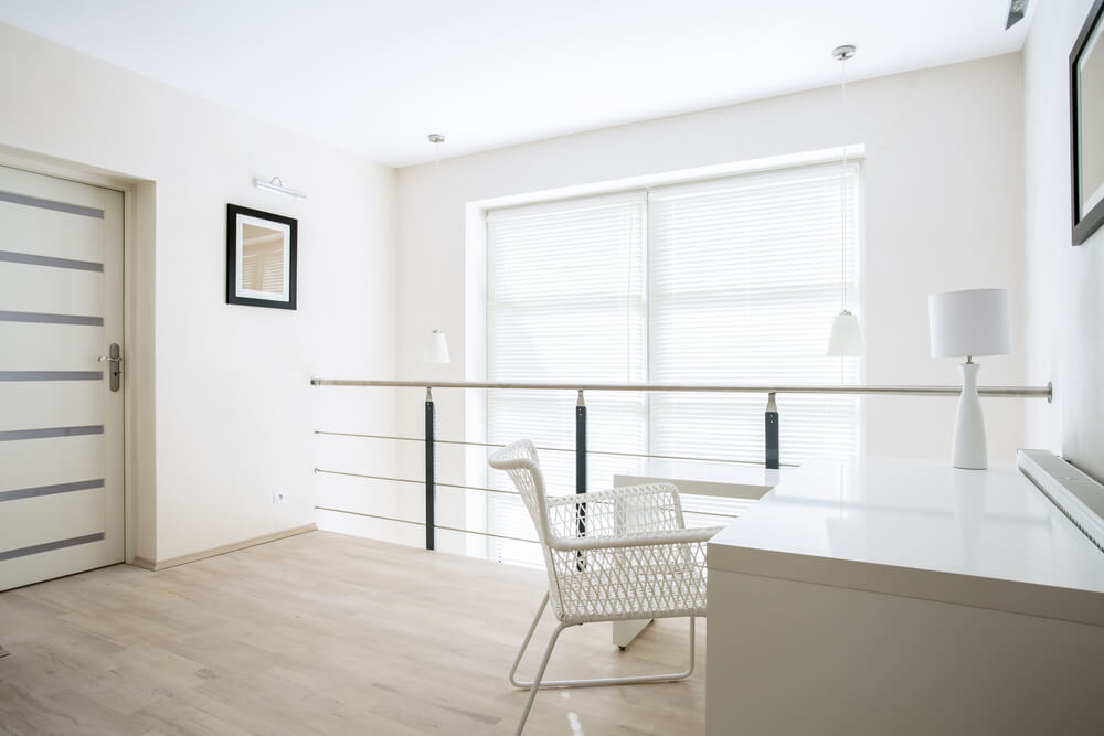 寝室をホームオフィスにする場合は、ベッドについ横になりたくなってしまうのを防ぐために、ガラスのスクリーン扉やブラインドなどで仕切るレイアウトがおすすめ。壁よりも圧迫感が出ない上に、インテリアの観点からもおしゃれなアクセントになります。