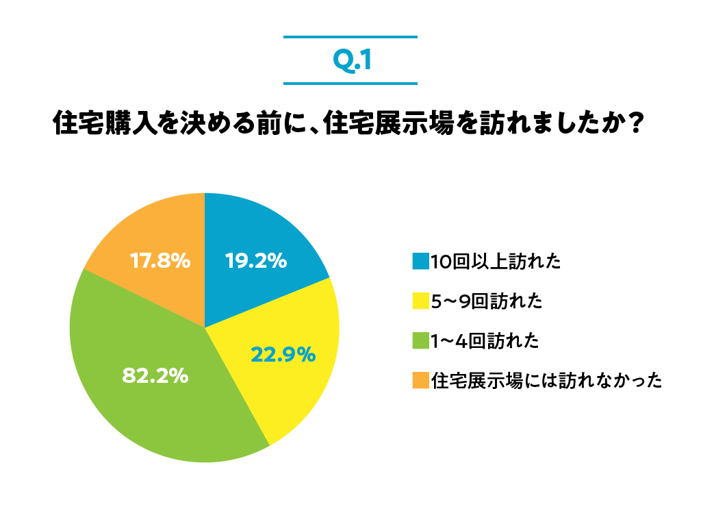アンケートから分かったのは、「購入者のほとんどが住宅展示場に足を運んだことがある」という事実。「住宅購入を決める際に、住宅展示場を訪れましたか?」という設問に対して、訪れなかったと回答したのは全体のうち17.8%で、残りの82.2%の人は1回以上の来場経験があると回答しました。