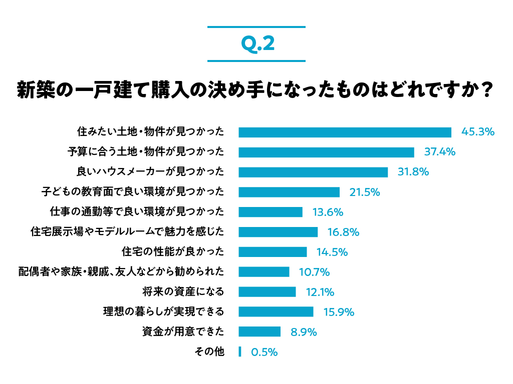 その結果、第1位「住みたい土地・物件が見つかった(45.3%)」第2位「予算に合う土地・物件が見つかった(37.4%)」に次いで、「良いハウスメーカーが見つかった(31.8%)」が第3位と続いています。