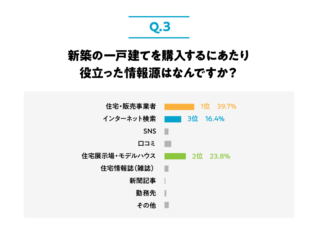 また「新築の一戸建てを購入するにあたり役立った情報源」について伺ったところ、第1位「住宅・販売事業者(39.7%)」。次いで第2位が「住宅展示場・モデルハウス(23.8%)」第3位が「インターネット検索(16.4%)」という結果になっています。