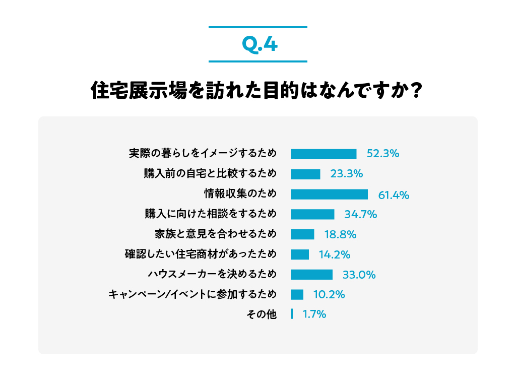 上記を裏付けるように、「住宅展示場へ訪れた目的」では第1位「情報収集のため(61.4%)」、第2位「実際の暮らしをイメージするため(52.3%)」に次いで、第3位「ハウスメーカーを決めるため(33.0%)」となっており、3割近い方がハウスメーカーを決めるために住宅展示場を活用していることもわかりました。