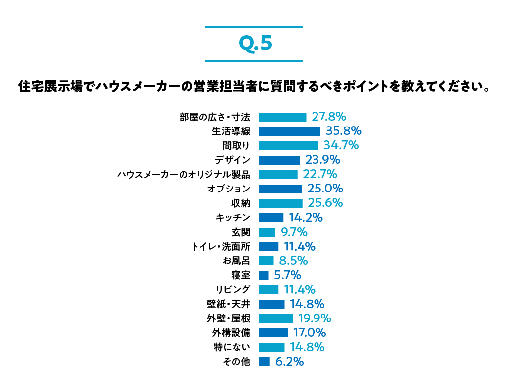 住宅展示場見学を有意義な時間にするためには、来場前に予備知識を得ていくことが大切です。そこで「住宅展示場でハウスメーカーの営業担当者に質問すべきポイント」についてアンケートを取ったところ、以下のような回答が得られました。